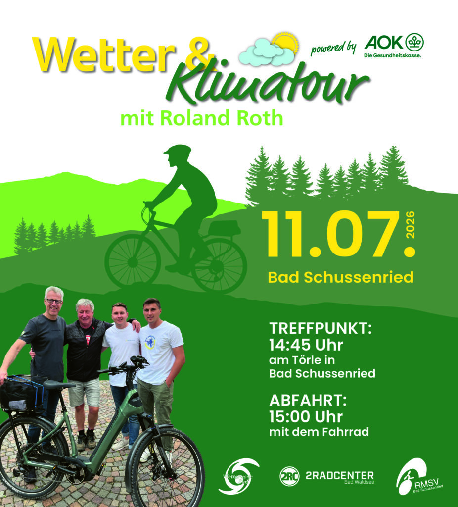 Der RMSV Bad Schussenried präsentiert ein besonderes Ereignis: die Wetter & Klimatour am 11.07.2026. Entdecken Sie auf einer 30 km langen Fahrradtour die Schönheiten der Region und erhalten Sie faszinierende Einblicke in Wetterphänomene und Klimaveränderungen in Oberschwaben, präsentiert von Roland Roth von der Wetterwarte Süd.