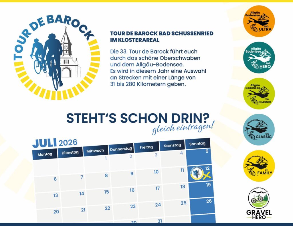 Als Präsenzveranstaltung findet die Tour de Barock am 12. Juli 2026 mit Start und Ziel im wunderschönen Klosterareal in Bad Schussenried im Rahmen des jährlichen Parkfests der Bad Schussenrieder Vereine statt.