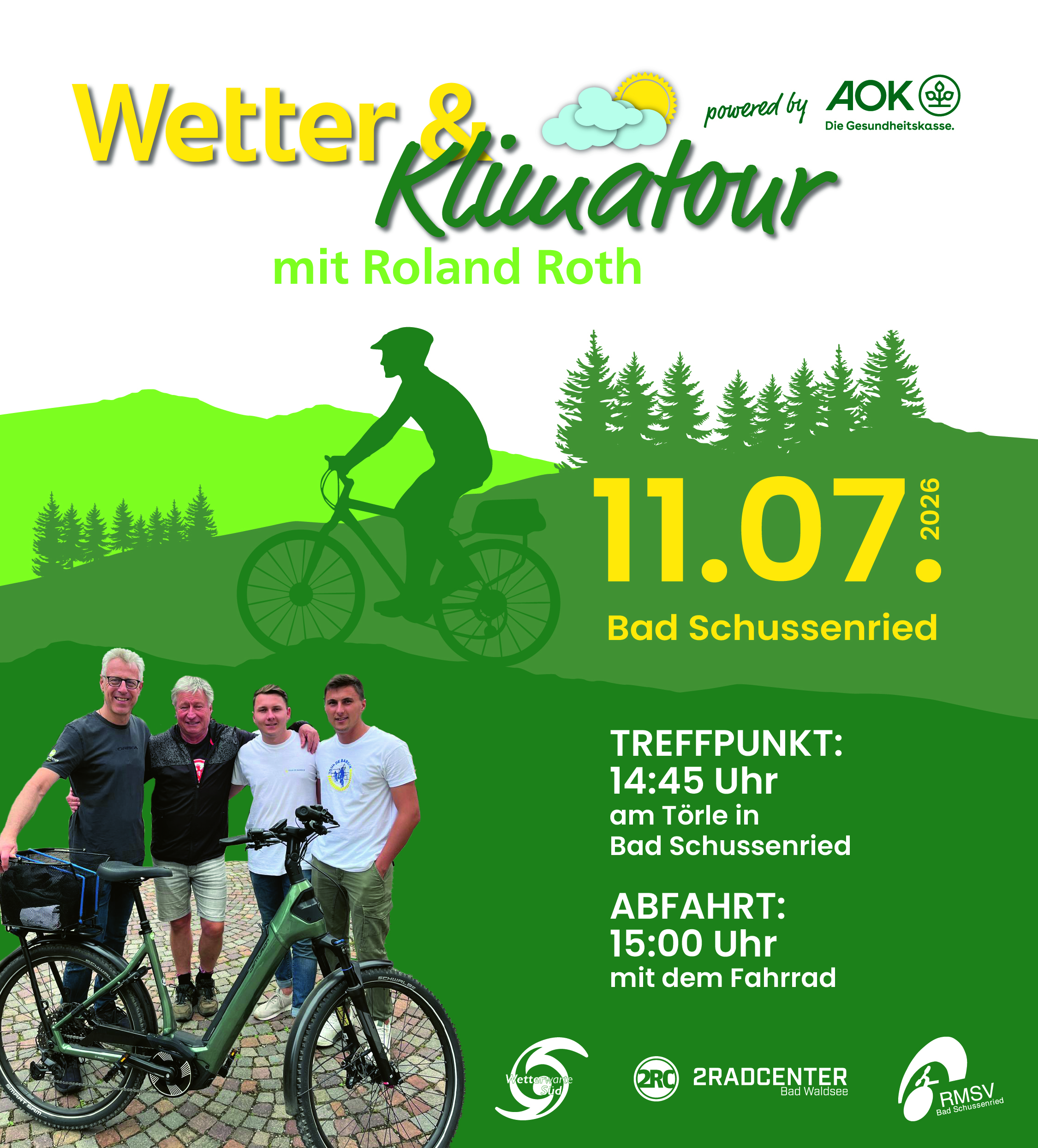 Der Rad- und Motorsportverein Bad Schussenried präsentiert Ihnen ein besonderes Erlebnis: die Wetter & Klimatour. Begeben Sie sich auf eine faszinierende 30 km lange Fahrradtour durch die idyllische Landschaft Oberschwabens und entdecken Sie dabei interessante Einblicke in die regionalen Wetterphänomene und den Klimawandel, präsentiert von Roland Roth von der Wetterwarte Süd. Diese interaktive Tour, geeignet für E-Bike- und herkömmliche Radfahrer, führt Sie zu verschiedenen Stopps, an denen Sie nicht nur die Schönheit der Natur genießen, sondern auch wertvolles Wissen über unsere Umwelt erlangen können.